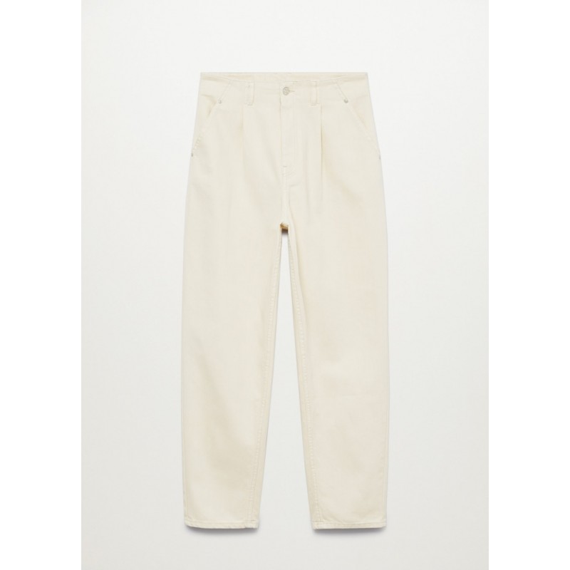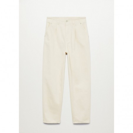 Bawełniana tkanina w stylu denim. Podwyższony stan. Szlufki. Dwie kieszenie boczne. Dwie kieszenie nakładane z tyłu. Zapięcie na suwak i guzik. Model długi.